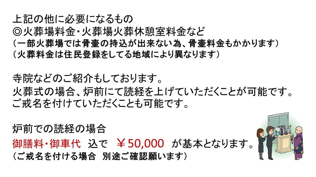 祭壇を飾らず、会葬者を招かないので、儀式で生じる費用や、会葬者への接待の費用が軽減でき最も経済的な葬儀です。